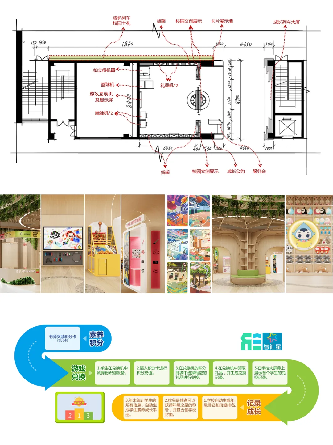 在五育融合的框架下,空間設(shè)計本身成為隱性課程,正在實現(xiàn)環(huán)境育人。階梯式積分隱喻成長攀登過程,任務(wù)區(qū)的AR場景激發(fā)探索欲。這些設(shè)計語言將教育理念轉(zhuǎn)化為可觸摸、可體驗的實體符號,讓全面發(fā)展從口號變?yōu)榭梢姷男袆勇窂健?