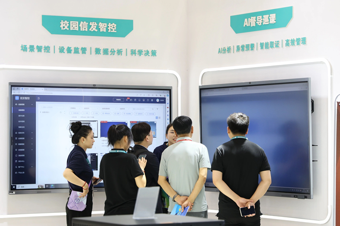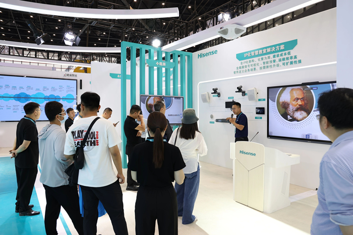 展會現場,海信觸控產品新品MR5F-PRO系列亮相,打造AR教室、校園樓棟信息發布、AI督導巡課、校園信息智控發布等場景,展示新時代智慧校園圖景。