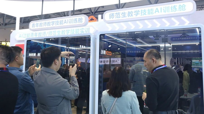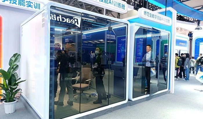 走進現(xiàn)代中慶展位,首先引入眼簾的是兩個時尚的茶色艙體,這是本屆展會最為亮眼的教育裝備之一“教學(xué)技能AI訓(xùn)練艙”,當(dāng)您推開艙門的那一刻,您就走進了現(xiàn)代中慶第一個AI應(yīng)用場景:AI教學(xué)技能實訓(xùn)。