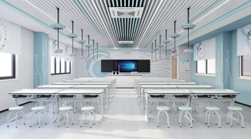 碟形氛圍燈搭配藍色光影營造未來感教學空間,多功能電源供應裝置支持高低壓、交直流等多種接口,USB擴展設計兼容各類智能設備。液晶觸控顯示屏實時顯示運行數據,防誤觸保護與高度自由調節適配不同身高學生。在第83屆中國教育裝備展示會上,該系統憑借“全場景安全防護+個性化教學支持”的特性,成為現場教育裝備觀摩的亮點。