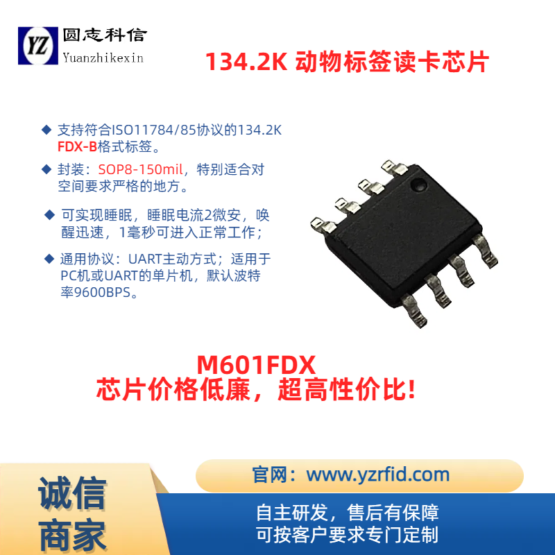 產品詳細介紹M601FDX 134.2K FDX-B格式標簽讀卡芯片 >>產品描述 可實現對134.2K FDX-B格式動物標簽的讀取 外圍電路簡單 可實現睡眠,睡眠電流2微安,喚醒迅速,1毫秒可進入正常工作 無需接外部晶振,可減少外部器件數量 支持134.2K FDX-B格式動物標簽卡 適用于PC機或UART的單片機,默認波特率9600BPS 封裝:SOP8-150mil,特別適合對空間要求嚴格的地方 配以M601FDX評估板KF601FDX,可實現用戶應用快速開發,以達到短時間進入市場目的