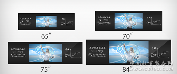 三、產品優勢 粉筆書寫,防水防暴: 可以用粉筆直接書寫、擦除、清洗筆跡;自動感應識別,表面大量積水仍可正常觸控;防眩鋼化玻璃,防暴、防刮擦、抗擊打;圓角設計,對學生細致入微的安全防護; 視聽結合,智慧教學: 支持視頻、音樂、圖片、PPT等各類多媒體教學軟件;Windows操作系統,傳統界面,簡單易懂;專業教學軟件,滿足教學所需; 防眩技術,綠色護眼: 高光過濾技術,有效過濾80%有害光,保護視力;防眩光技術,對光線漫反射處理,防止反光;178°可視角度,不影響外側兩排學生觀看; 純平外觀: 純平表面無邊框,灰塵不影響觸控;信號拼接轉換功能,單屏、雙屏自由組合;時尚、科技,與現代化教學場景融為一體; 觸顯一體,多人互動: 20點電容靈敏觸控,滿足多人同時互動;全高清4K液晶顯示,LED節能背光,畫面清晰、細節突出;高配工控主機,無線上網,USB存儲; 尺寸多元,多場景適用: 84寸,超大尺寸顯示屏,適合高職、大學等階梯教室使用;75寸,比普通黑板略大,適合初高中較大室內空間使用; 70寸/65寸,和普通黑板大小相同,適合幼兒園或者空間較小的教室使用 |