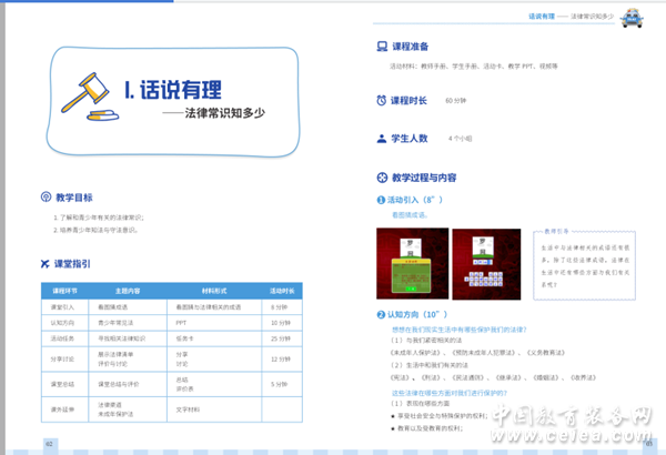 依據(jù)青少年認(rèn)知發(fā)展水平,通過課程增強(qiáng)學(xué)生的知法意識(shí)、守法意識(shí)、法制自我保護(hù)意識(shí)、法制防范意識(shí)以及樹立用法律手段處理現(xiàn)實(shí)問題的意識(shí)等。希望青少年在知法、守法的基礎(chǔ)上,能以法制的觀點(diǎn)去看待和解決生活中遇到的法律問題,通過課堂觀察和實(shí)踐,初步形成運(yùn)用法律手段維護(hù)自身合法權(quán)利的能力,而最終將法制意識(shí)內(nèi)化于心,外化于行,為健全人格和他們未來的和諧發(fā)展奠定基礎(chǔ)。