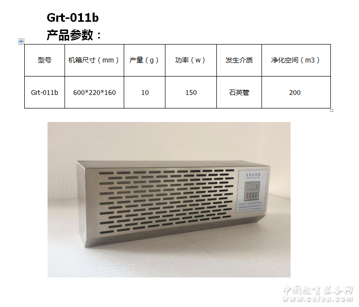 型號 臭氧產量 臭氧濃度 功率 使用電源 機身尺寸(mm) 凈化面積 冷卻方式 氣源 Grt-910s 10g 15-30mg/L 150W 220v/50hz 600*160*220mm 200m3 風冷 空氣 |