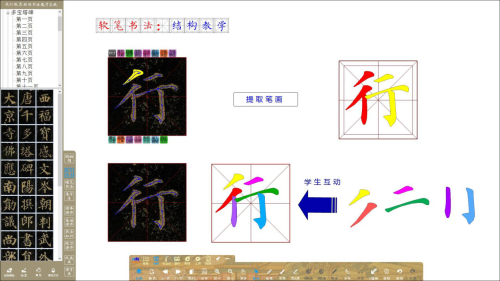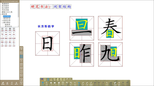 可提取單字中的任意筆畫進行講解,將筆畫進行輪廓化、填色,并可配合使用內(nèi)置九宮格、米字格、回米格等書法專用圖形格進行字型結(jié)構(gòu)講解;學(xué)生可以在電子白板/教學(xué)一體機上體會點畫與點畫之間的位置關(guān)系,進行自主組合搭配訓(xùn)練,加強對字型結(jié)構(gòu)的理解。