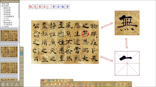 筆畫、單字與原帖相互提取,包含:單字到碑帖、單字到筆畫、筆畫到原碑帖、碑帖到單字相互提取;便于教師講解筆畫在單字、單字在原帖中的章法關(guān)系,及碑帖賞析與講解。