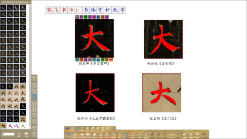 系統(tǒng)具有“同字比對”功能,可一鍵呈現(xiàn)單字在碑帖及全息手寫字庫中的全部字例,對所有同字的相同點畫的筆法分析,以及不同結(jié)構(gòu)特征的比對講解,并可使用智能書法筆進行書寫示范,書寫仿真度高。