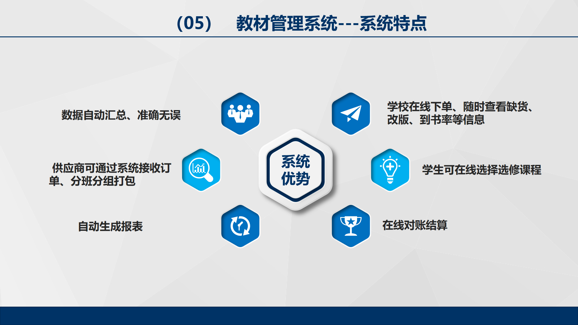 產品詳細介紹教材管理系統,是以減輕學校及供應商負擔、提高工作效率、避免差錯為目的,實現了教材遴選、在線分配教材訂單、實時監控訂單進度、教材按校區、班級等形式分包供應、學生可在線選擇選修課程、學生預約領書時間、自動生成對賬單等功能,疫情期間,特增加了教材郵寄模塊。