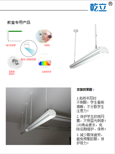 產品詳細介紹乾立LED健康教育照明之LED黑板燈系列產品,產品具備高顯指、無藍光危害、無頻閃、防眩光和易安裝易調節燈特點和特性。